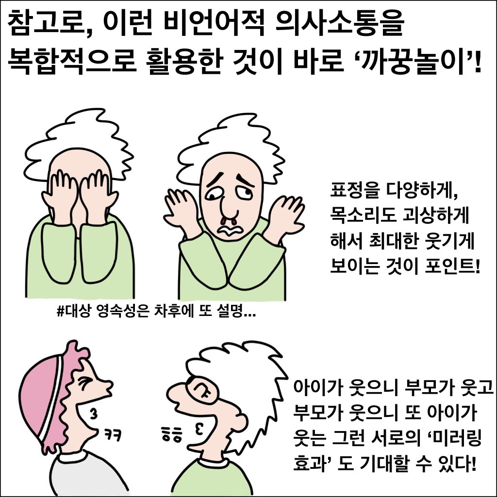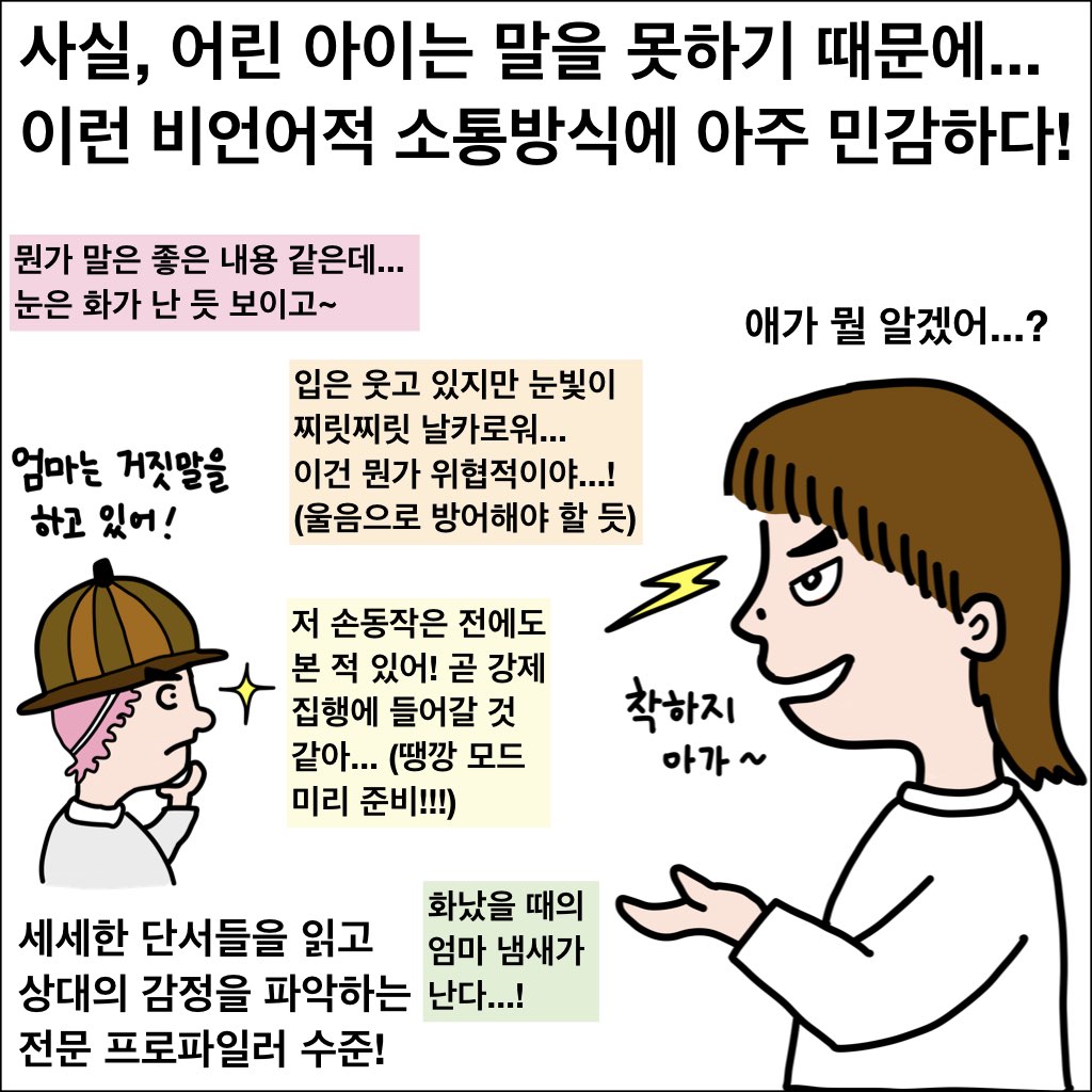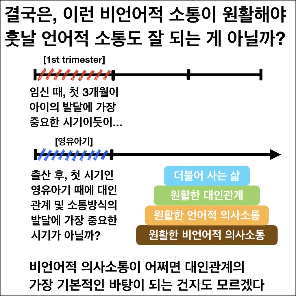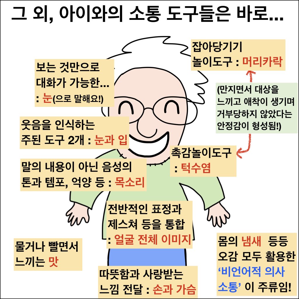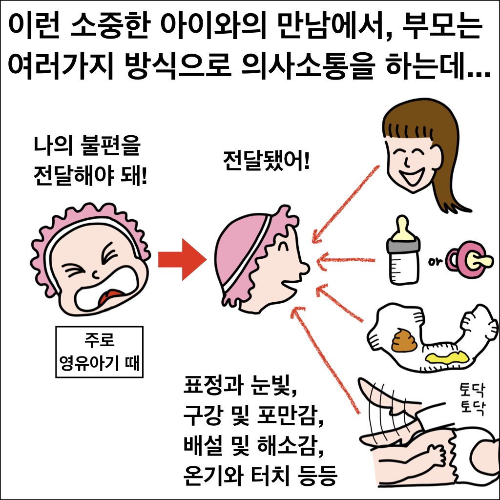흔히 육아를 하는 주위 친구들은, "그래도 지금은 말 못 하니 키우기 낫지. 나중에 커 봐, 더 힘들어!"라고 하지만, 어쩌면 말을 하지 못하는 그 시기가 가장 신경써야 하는 중요한 시기일 수 있다. 아이는 말만 못 할 뿐이지, 거의 하루 종일 부모의 비언어적 신호에 촉각을 곤두세우고 지켜보고 있기 때문이다. 무엇이든 첫 시작이 중요하다!