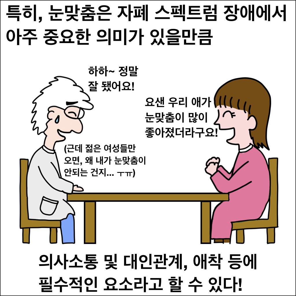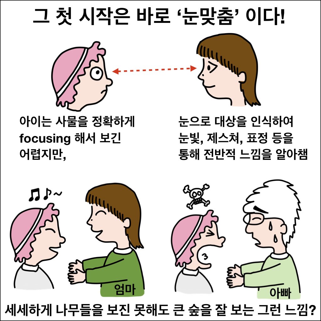 눈맞춤은 대화의 기본이란 것 이외에도 그 이상의 뭔가가 있다. 흔히 눈은 마음의 창이라고 하듯이, 눈을 마주치는 것은 서로의 진심을 마주한다는 의미로 볼 수 있는데, 결국은 아이와의 소통에 있어서도 백 마디 말보다는 부모의 진심이 진정 필요한 것이 아닐까.그래서, 진심을 나누는 눈맞춤은 더욱 중요하다. 또 아이의 측면에서는, 아이의 눈이 감각적으로는 어른보다 훨씬 뛰어날 수 있다. 즉, 엄마의 눈이 어떻게 생겼는지는 잘 몰라도, 그게 화난 눈이라는 것은 느낄 수 있다는 말이다.