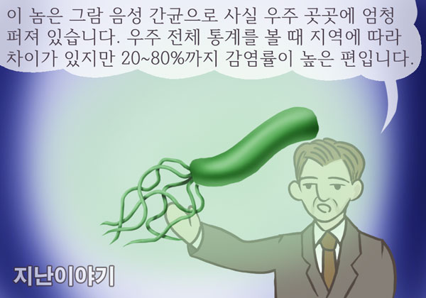 지난 에피소드에서는 헬리코박터 파일로리 균에 대한 소개는 거의 못해드렸습니다. 그람 음성 간균인 헬리코박터 파일로리는 나선형의 체부와 4~6개의 섬모를 지니고 있는 특이한 모양의 세균입니다. 원래부터 인간의 위 속에 있는 것은 아니지만 ‘fecal-to-oral route’을 통해 침입이 가능합니다. 따라서 주로 비위생적인 공중보건의 국가에서 많긴 한데, 부끄럽게도 한국에 많이 퍼져 있습니다.