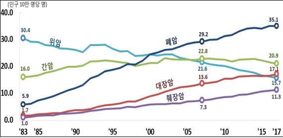 통계청의 ‘2017년 주요사망원인 통계’에 따르면 지난해 한국인 사망원인 1위는 암이었다. 그중에서도 폐암은 10만 명당 사망률이 35.1명으로 2위인 간암(20.9명)보다 1.7배, 3위인 대장암(17.1명)보다 2.1배나 높으며 그 상승세 또한 매우 가파르게 증가하고 있다. (그림 1)