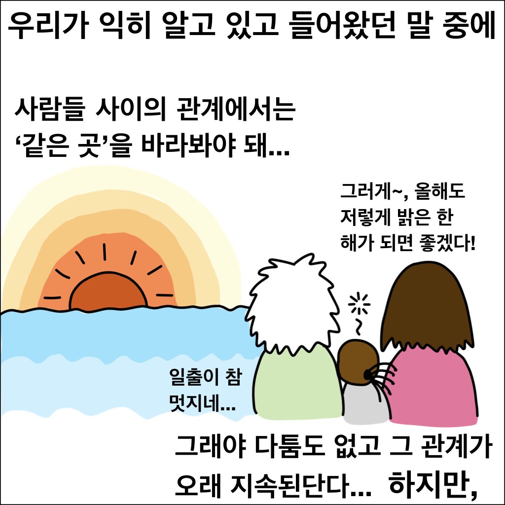 살아온 환경이나 자신이 겪어온 경험 및 판단이 다르므로, 우리는 사람을 만나서 같은 곳을 바라본다는 것이 참 쉽지 않다.