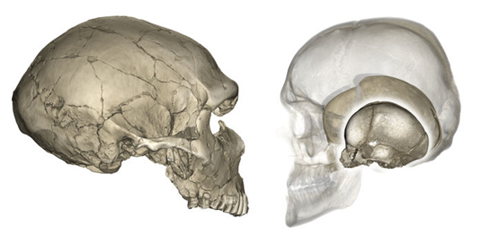 네안데르탈인의 두개골(왼쪽)은 - 마치 럭비공처럼 - 앞에서 뒤로 길쭉하다. 현대인의 신생아(오른쪽)와 유아(오른쪽 조그만 그림)는 약간 길쭉한 두개골을 갖고 있지만, 어른이 되면 - 마치 농구공처럼 - 동그란 모양의 머리를 갖게 된다.