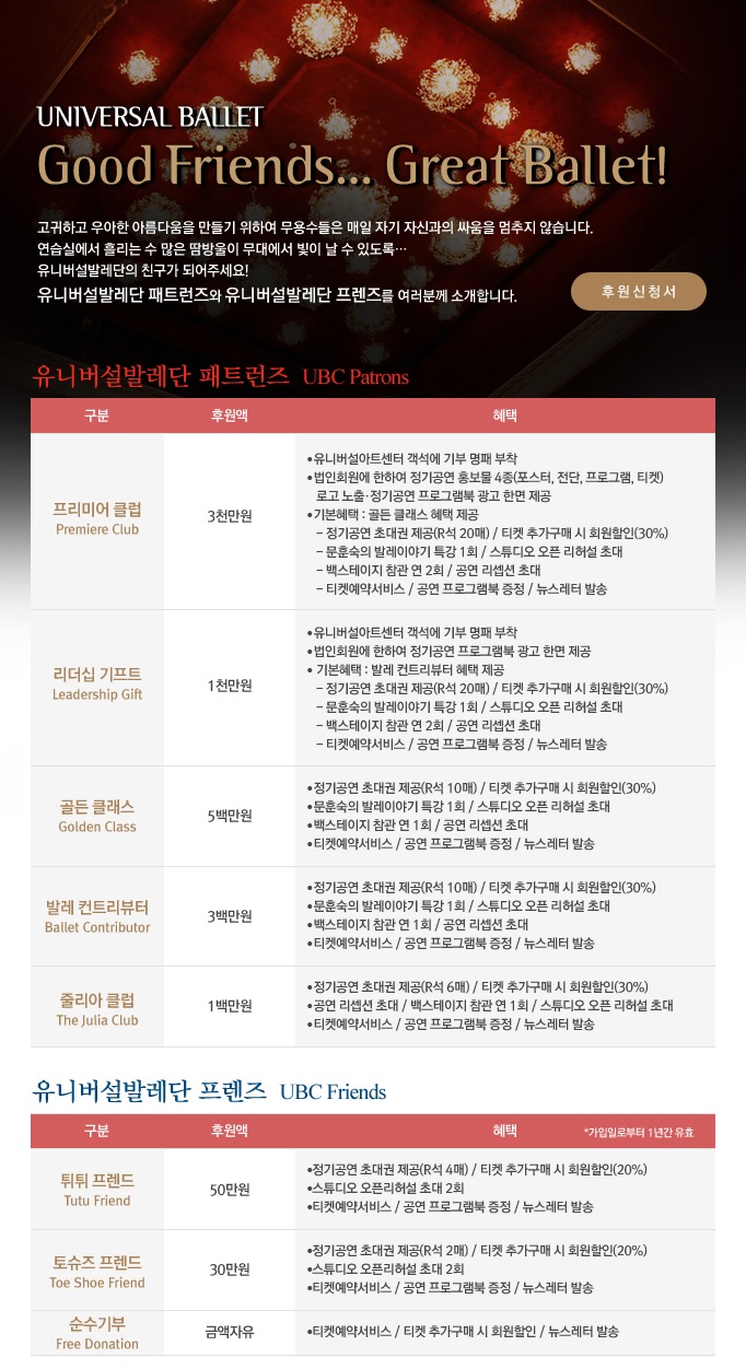 유니버설발레단 패트런즈 UBC Patrons는 프리미어 클럽부터 리더십 기프트, 골든 클래스, 발레 컨트리뷰터, 줄리아 클럽까지 다섯 단계로 나뉘며, 유니버설발레단 프렌즈 UBC Friends는 튀튀 프렌드, 토슈즈 프렌드, 순수기부 세 단계로 구성되어 있다.