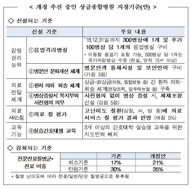 보건복지부는 지난해 메르스 사태 이후, 감염관리 및 의료전달체계 개선, 의료서비스 향상 등에 대한 필요성을 절감하고, 병원, 환자, 소비자 등의 유관단체, 관련 전문가, 건강보험심사평가원 등과 함께 2차례 협의체 회의 등을 통해 상급종합병원 지정기준 개정안을 마련하여 7월8일부터 8월17일까지(40일간) 입법예고한다고 밝혔다.