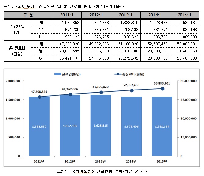 최근 5년간 (2011~2015년)의 건강보험 및 의료급여 심사결정 자료에서 나타난 ‘외이도염‘의 진료 추이를 살펴보면, 진료인원은 평균 160만명정도 수준으로 최근 2015년에는 약 158만명이 진료를 받았으며, 총진료비는 2015년 기준 약 539억원으로 2011년부터 연평균 3.3%씩 꾸준히 증가추세를 보였다.