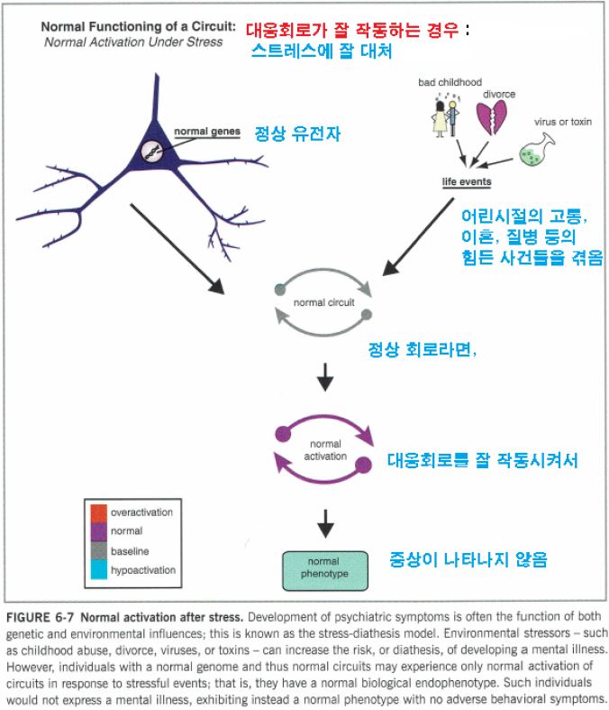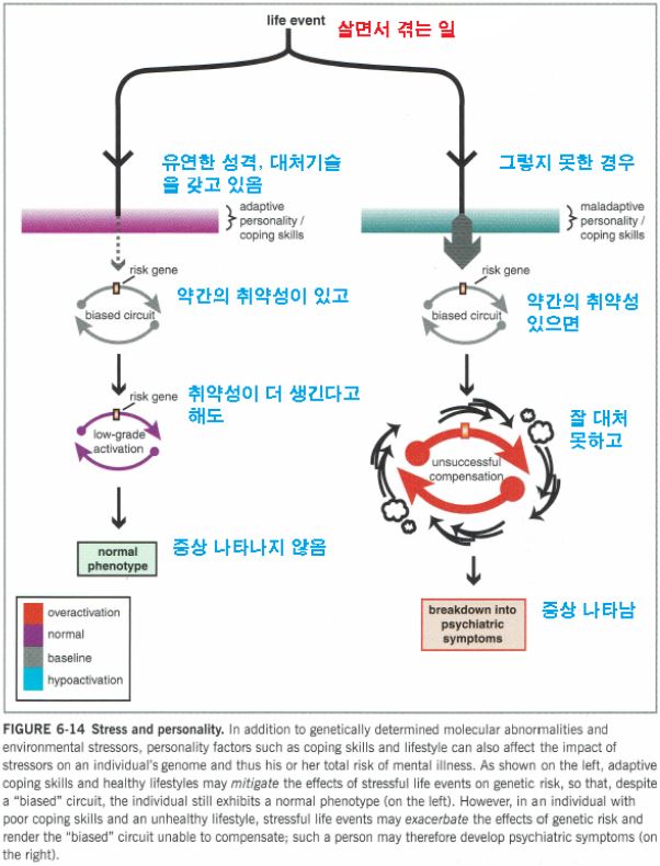조물주가 그렇게 만들었건 진화가 되었건 간에 우리는 스트레스(정보, 자극)에 대처하기 위한 내적 처리방법을 갖고 있습니다. 이 처리방법(회로)은 선천적으로 타고나는 측면(유전자)과 후천적으로 습득된(환경) 측면으로 구분할 수 있습니다. 취약한 유전자를 갖고 태어난 경우가 아니라면 보통의 스트레스는 잘 대응하고 넘어갑니다.