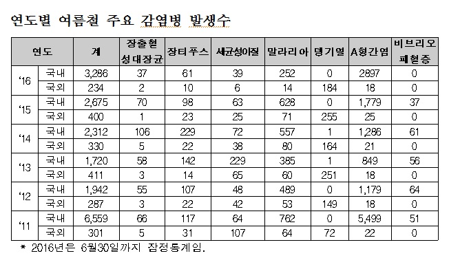 질병관리본부는 여름 휴가기간 동안 각종 감염병(수인성·식품매개감염병, 모기매개감염병, 진드기매개감염병, 호흡기감염병 등)이 증가할 수 있어, 국민들을 대상으로 철저한 손씻기, 모기물리지 않기와 안전한 음식물 섭취로 감염병을 예방할 것을 당부했다.