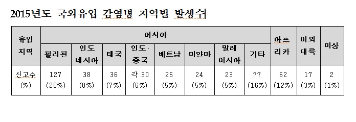 국외유입 감염병 사례는 2010년 이후 매년 300~400건 내외로 2014년 400명에서 2015년 491명으로 23% 증가하였으며, 특히, 최근 중남미를 중심으로 임신부 감염시 소두증 신생아 출산 가능성이 제기되고 있는 지카바이러스 감염증 발생 국가가 지속 확인되고 있어 임신부의 경우 해당 국가로의 여행 연기를 권고중이며, 동남아 지역에서 뎅기열 발생증가와 지카바이러스 감염증도 보고되고 있어, 일반 여행객도 여행 중 모기에 물리지 않도록 주의가 필요하다고 밝혔다.