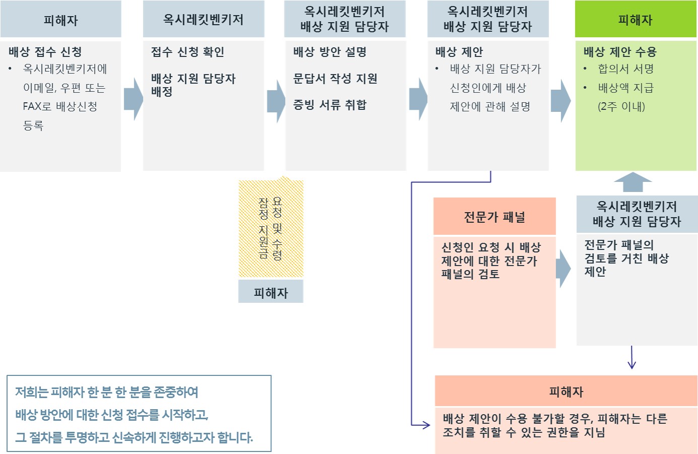 배상 신청 접수는 정부의 1, 2차 조사에서 1, 2 등급 판정을 받은 옥시 가습기 살균제 피해자 대상으로 8월 1일 (월) 부터 진행된다. 배상안의 세부 내용 및 배상 신청서는 당사 홈페이지 (www.oxy.co.kr)에서 확인할 수 있으며, 배상 신청은 해당 홈페이지에서 배상신청서를 다운 받은 후, 해당 신청서를 이메일(care@oxy.co.krcare@oxy.co.kr)이나 팩스(02 -761-2121) 혹은 우편으로(150 -945, 서울 영등포구 국제금융로 10 국제금융센터 24층 옥시 배상지원센터 앞) 송부하여 접수를 진행 할 수 있다. 배상 신청 방법 및 기타 추가 문의 사항은 당사 배상지원센터(080 -699699 -2273)를 통해 문의 가능하다.