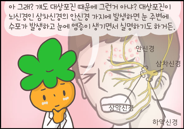 해당되는 신경 부위이기 때문에 피부신경절을 따라서 피부에 수포성 발진이 발생하게 되고 또한 신경통을 유발하게 되는 것입니다. 대개 통증이 먼저 시작되고 며칠 뒤 피부병변이 발생하게 되는데, 처음에는 발진만 있다가 수포가 동반되고 농포로 바뀐 뒤에 딱지가 앉게 됩니다. 아무런 흉터도 없이 나을 수도 있지만 색소침착이나 흉터가 생길 수도 있습니다.