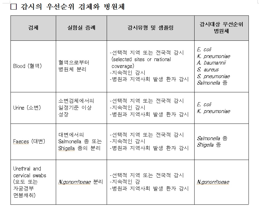 질병관리본부는 GLASS 감시체계의 국제 표준 자료를 산출하기 위하여 6개 권역의 종합병원을 항생제 내성 감시기관으로 지정하여 임상진료 환자에서 분리된 균주의 항생제 감수성 검사와 항생제 내성 유전자 특성 조사 등 병원체 감시를 수행 중에 있으며(‘16년 5월부터), 감시결과는 ’17년 5월 경 WHO GLASS 및 국내 관련 웹사이트를 통해 공개할 예정이다.
