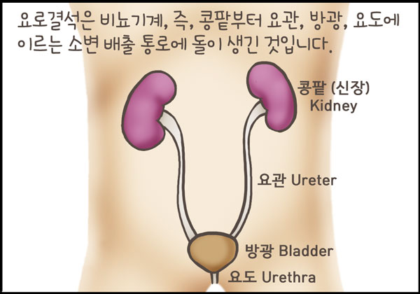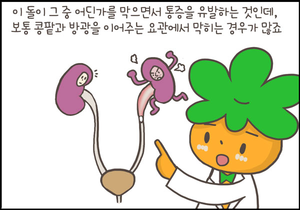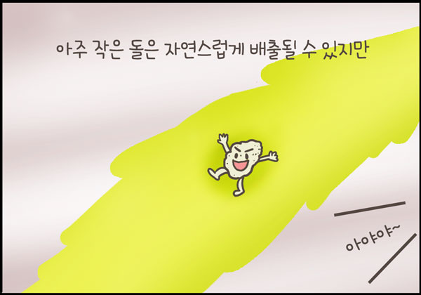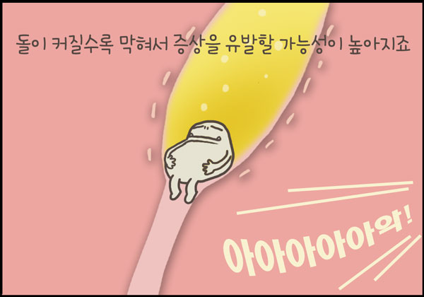 작은 돌 같은 경우 자연스럽게 소변과 함께 배출될 수 있는데 크기가 너무 큰 경우에는 그대로 그 통로를 막을 수 있습니다. 이 과정에서 통증이 발생할 수 있습니다.