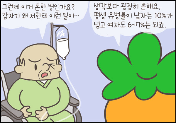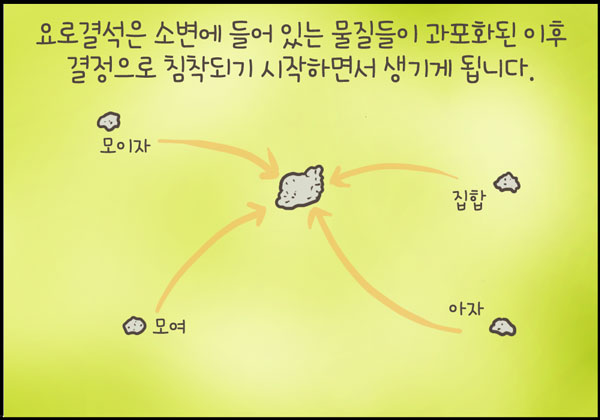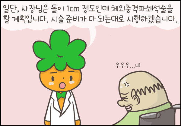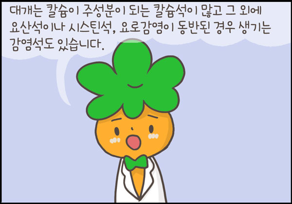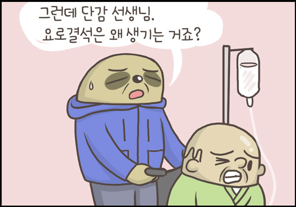 몸에서 돌이 생기는 경우가 있습니다. 닥터단감에서도 담석증, 즉 쓸개에 돌이 생기는 질환에 대해서 다루어보았는데 오늘은 요로결석에 대해서 그려보았습니다. 요로 결석은 말 그대로 소변이 지나가는 길에 생기는 돌입니다. 그럼 왜 소변이 지나가는 길에 돌이 생기느냐? 소변의 주성분인 칼슘이나 요산 등이 결정으로 형성되면서 돌이 생기는 것입니다.