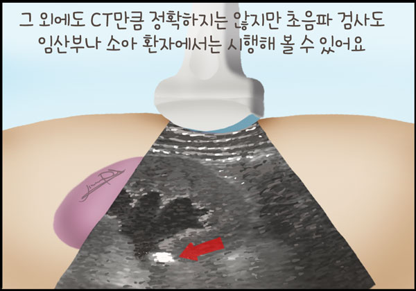 의심이 되는 경우 요즘은 무조영제 전산화 단층촬영(CT, computed tomography)을 통해 진단하기도 하고 산모나 어린아이에게는 초음파를 사용하기도 합니다.