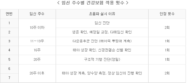외국은 3~4회 급여를 인정하고 있으나, 우리나라는 초음파 장비 보유율이 높아 산전 진찰시(최대 15회 방문) 태아 상태를 초음파를 통해 확인하므로 의료기관별로 초음파검사 횟수와 비용이 다양하다.