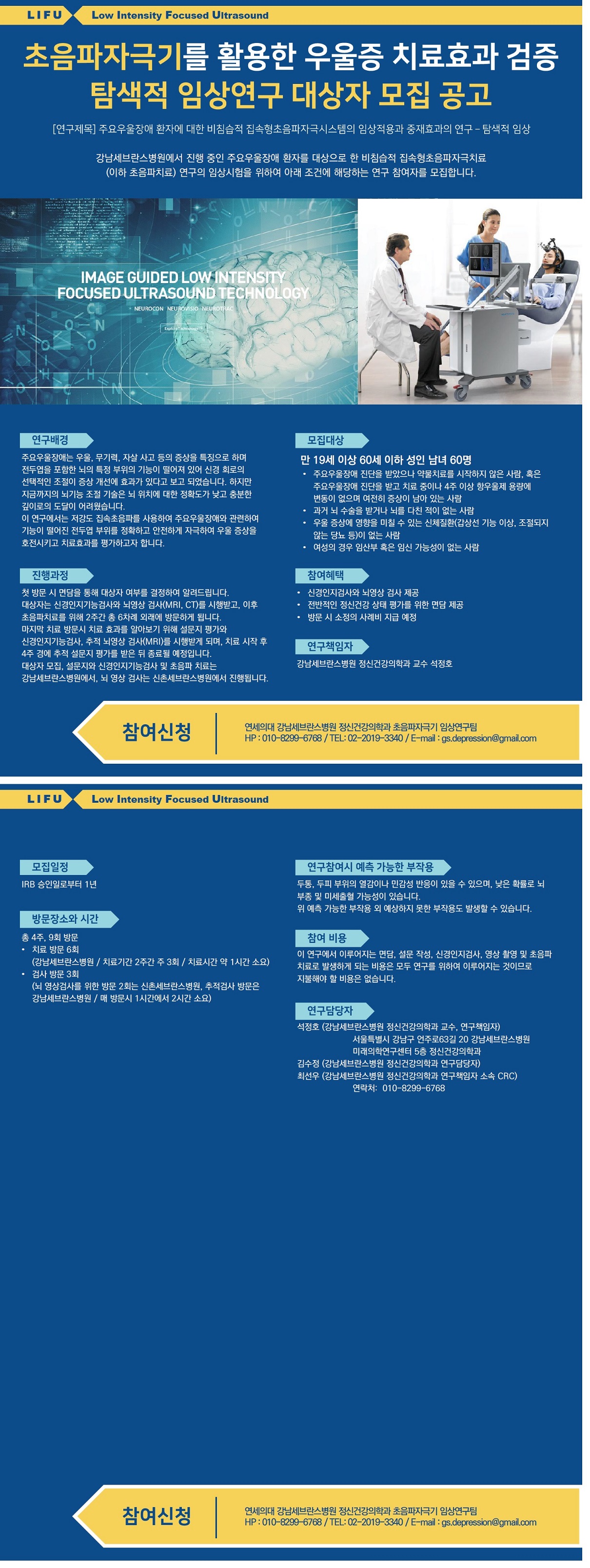 이 연구에서는 저강도 집속초음파를 사용하여 주요우울장애와 관련하여 기능이 떨어진 전두엽 부위를 정확하고 안전하게 자극하여 우울 증상을 호전시키고 치료효과를 평가하고자 합니다.