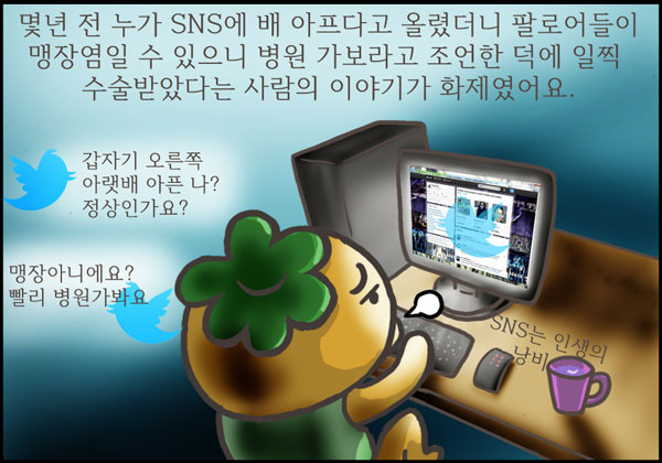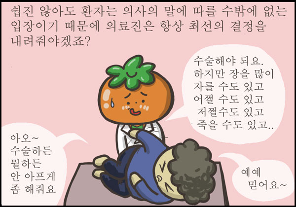 하지만 안타깝게도 한국 인터넷 환경 (Google과 비교해 봐도 정보의 질에 심각한 격차가 있습니다) 에서 의학정보와 관련되어서 “정확하고, 유익하고, 재미있는” 정보를 찾기 힘듭니다. 잘못된 정보가 그들을 잘못된 길로 인도하는 경우도 자주 발생합니다. 이런 배경에서 환자들을 위한 “정확하고 유익하고 재미있는” 정보를 제공할 방법에 대해 고민하였고, 결국 ‘의학만화’를 그려보자는 결론에 도달하게 되었습니다.