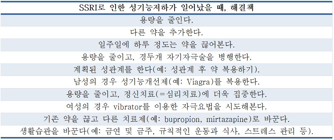 : 치료자 입장에서 말씀드리면, 먼저 성기능저하가 일어나는 원인을 파악합니다. 성기능저하는 신체 질환, 심리적인 요인, SSRI 외 복용 약물 등 다양한 요인에 의해 발생하므로, 여러 가능성을 살핍니다. 그러나 현재 복용 중인 SSRI에 의한 성기능저하가 확실하다고 하여도 치료 효과를 고려해야 하기 때문에, 즉각 약을 중단하거나 감량하거나 혹은 다른 약으로 대체하는 것은 매우 조심스럽습니다. 그러므로 때로는 스트레스 관리, 금주와 금연 등과 생활습관의 변화를 우선적으로 권유하기도 합니다. 또한 Scheduling Sex Activity(예: 성관계를 한 후에 약을 복용하기, 하루 정도 휴약기 갖기), Vibratory Stimulation(여성의 경우) 등과 같은 행동적인 요법을 시도해 볼 수 있습니다.