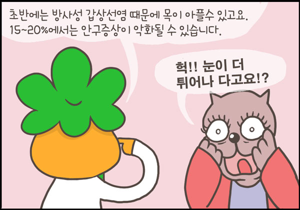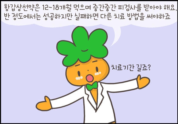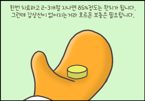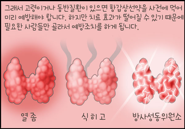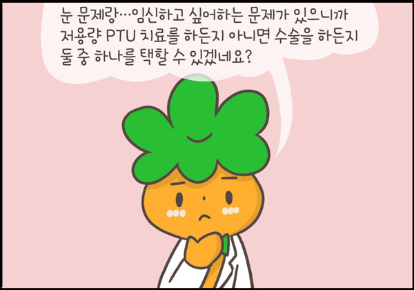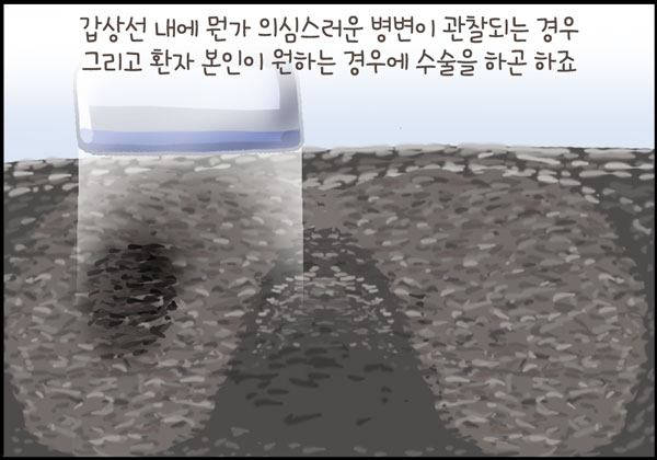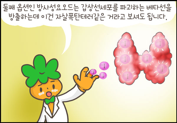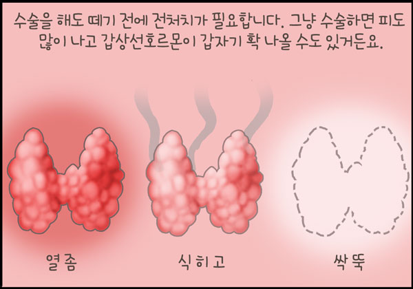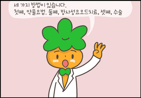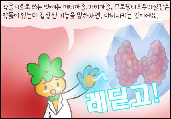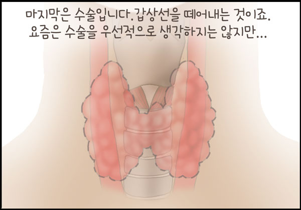 지난 에피소드에서 갑상선 갑상선 항진증이 무엇인지 살펴보았다면 이번 에피소드는 갑상선 항진증의 치료에 대해 그려봤습니다. 갑상선 항진증의 치료는 갑상선호르몬을 과다 생산 분비하고 있는 갑상선을 정상화시키거나 제거하는 것입니다. 그리고 그 방법은 세 가지가 있고요.