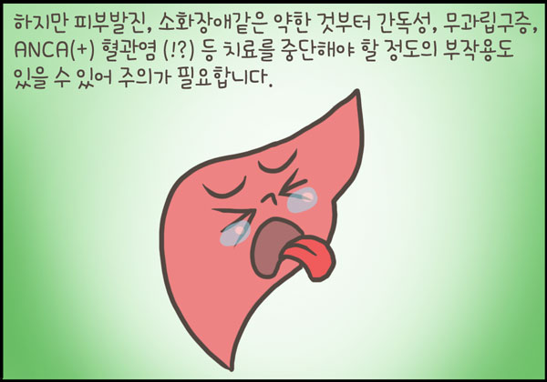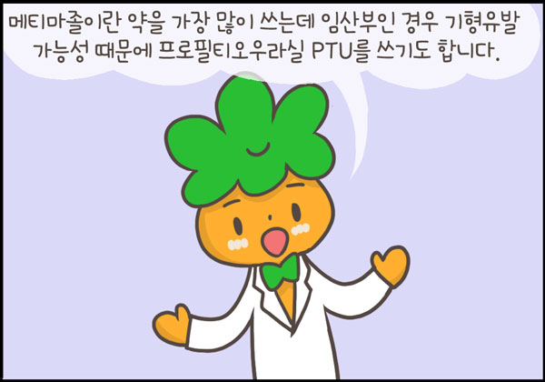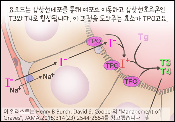 첫째는 항갑상선 약물을 쓰는 것입니다. 이 약물들은 갑상선 안으로 들어가서 갑상선 호르몬의 재료인 요오드가 흡수되고 호르몬으로 합성되는 것을 도와주는 TPO라는 효소를 막아버립니다. 이런 약은 12개월에서 18개월 정도는 꾸준히 먹으면서 경과를 지켜봐야 합니다. 메티마졸, 카비마졸, 프로필티오우라실 같은 약들이 있는데 메티마졸을 제일 많이 사용하지만 임신의 경우 부작용 때문에 프로필티오우라실을 사용합니다. 이런 약들은 피부발진, 소화장애부터 간독성, 무과립구증, 혈관염 등의 부작용이 발생할 수 있습니다.