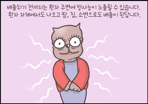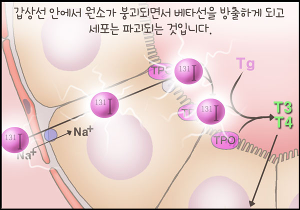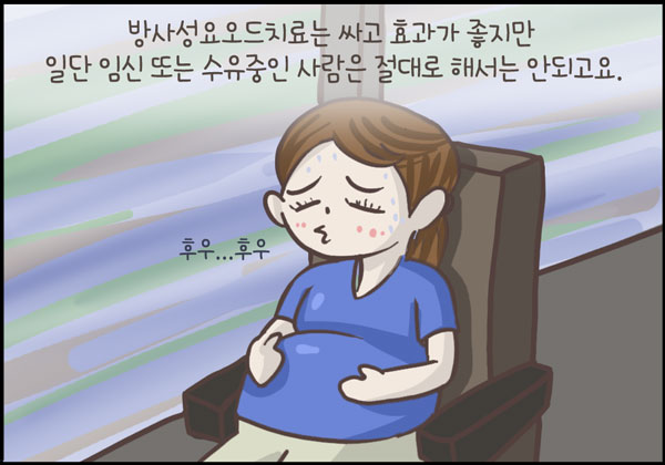 두 번째는 방사성요오드 치료입니다. 방사성요오드는 갑상선호르몬의 재료인 요오드의 방사성 동위원소로 갑상선에 쉽게 흡수가 되는데, 원소가 붕괴되면서 방출하는 베타선이 갑상선을 파괴합니다. 한 번의 치료로 2~3개월 후 85%에서 완치가 되지만 갑상선 호르몬을 계속 복용해야 하며, 임신이나 수유할 때는 시행 할 수 없고, 그게 아니더라도 몸에서 배출될 때까지 최소 5일 간은 타인과 1m 이내의 접촉은 피해야 합니다. 임신 계획이 있다면 방사성 동위원소 치료 후 6~12개월 정도 뒤에 가능합니다.