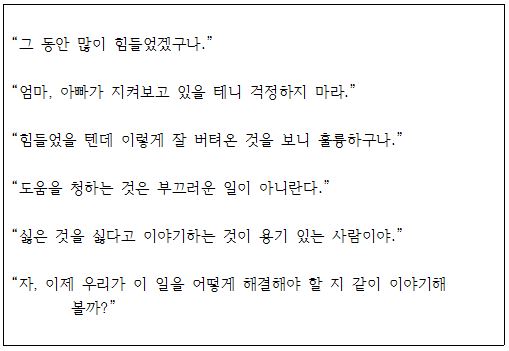 하지만 가장 힘든 것은 아이들이고, 혼란스러운 아이들을 바로 옆에서 도울 수 있는 사람이 바로 부모님이십니다. ‘호랑이에게 물려가도 정신만 차리면 산다.’는 속담처럼 지금은 부모님께서 본인의 정신줄을 꽉 잡아야 할 순간입니다.