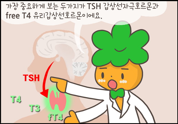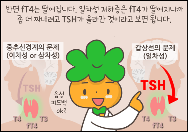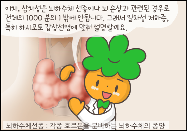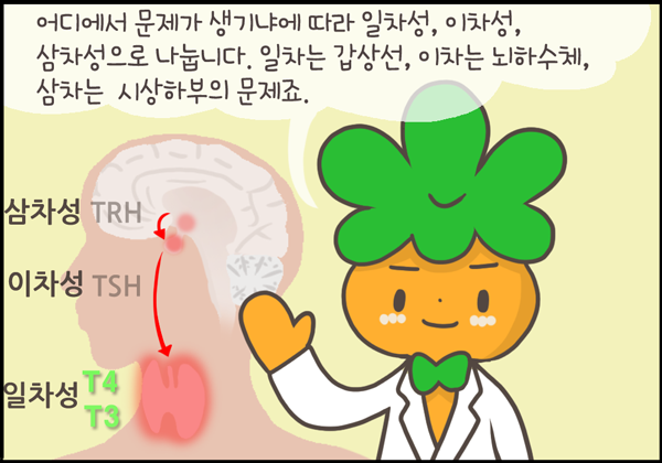 갑상선저하증은 여러 원인이 있을 수 있습니다. 갑상선 자체에서 호르몬이 나오지 않는 일차성, 갑상선을 자극하는 호르몬인 TSH를 분비하는 뇌하수체의 문제인 이차성, 그리고 이 뇌하수체를 자극하는 TRH를 분비하는 시상하부의 문제가 삼차성 갑상선저하증인데 가장 흔한 것은 일차성입니다.