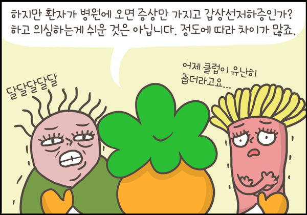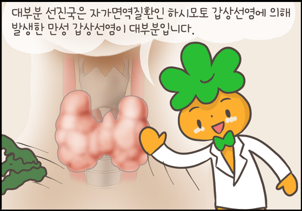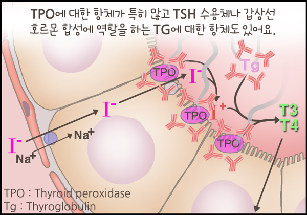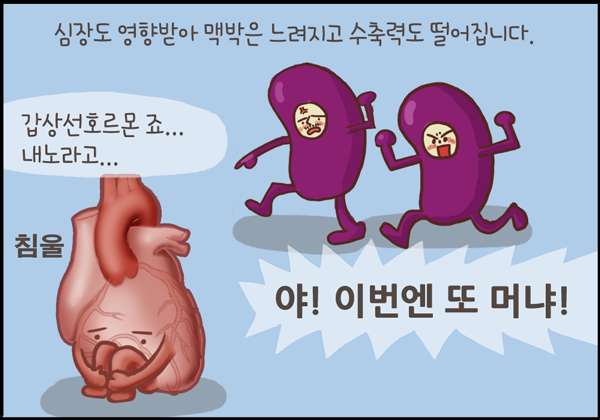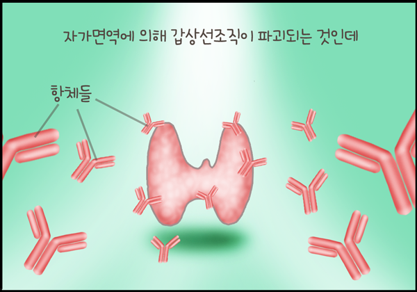 지난 주까지 갑상선항진증으로 나타나는 그레이브스 병에 대해서 알아보았습니다. 이번 주는 그 반대인 갑상선저하증, 특히 자가면역질환인 하시모토갑상선염에 대해서 그려보았습니다.