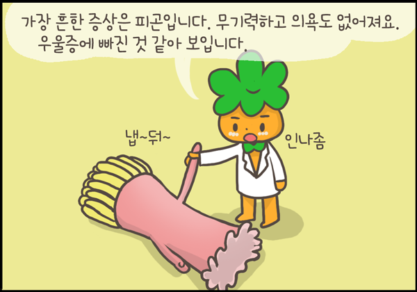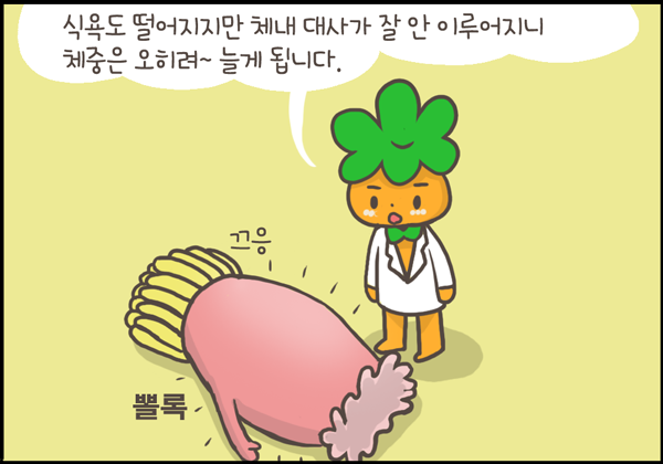 갑상선저하증의 가장 흔한 증상은 피곤입니다. 무기력하고 의욕도 없어지고 우울증에 빠진 것처럼 보입니다. 식욕이 떨어지지만 대사가 잘 안돼서 체중은 오히려 늘어나게 됩니다. 열 발산에 문제가 생겨서 저체온증이 올 수도 있고 추위를 못 견디게 됩니다. 목소리도 갈라지고 모발도 가늘어지고 전반적으로 맹~한 인상으로 변하게 됩니다.