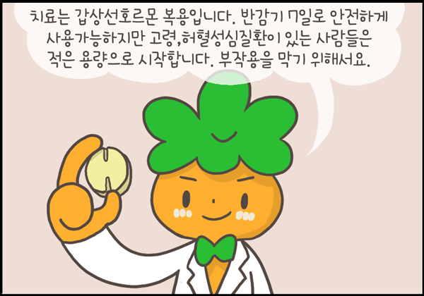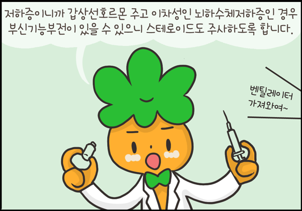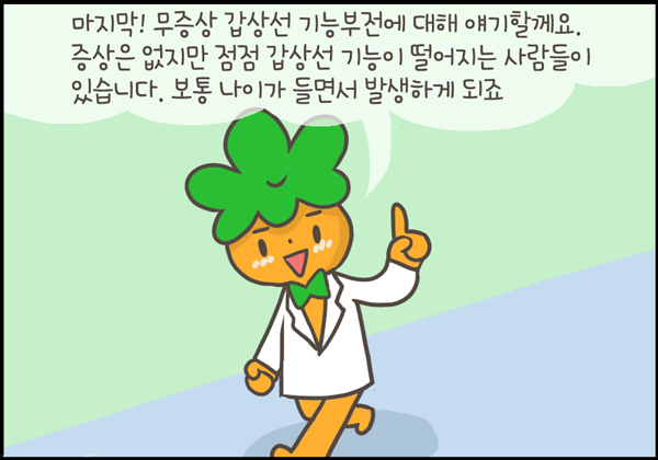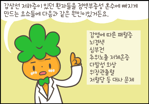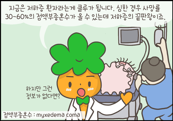 매우 드물지만 갑상선저하증의 끝판왕 격인 점액부종혼수가 오면 사망률이 30~60% 정도까지 이르기 때문에 그 전부터 관리를 잘하는 것이 중요합니다.