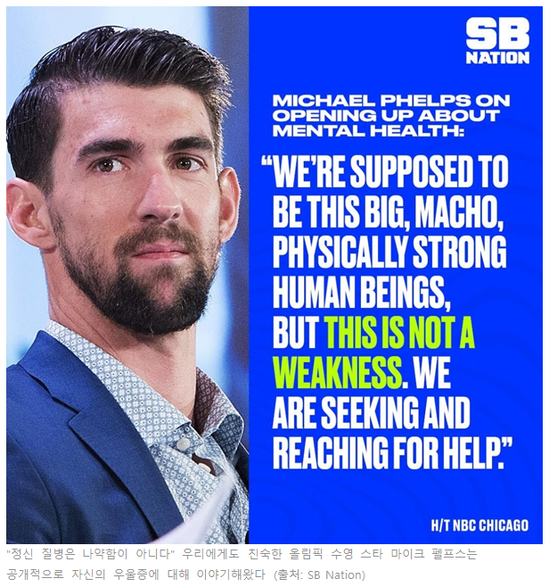 미국 내에도 정신질환에 대한 낙인은 당연히 존재한다. 하지만, 젊은 층을 시작으로 변화의 물결이 일었고, 지금은 그 결과 많은 사람들이 이전보다 편하게 심리/약물치료를 받고 있다. 그리고 그 변화의 물결에는 많은 연예인들, 유명인들이 스스로의 정신건강에 대해 이야기하는 것이 큰 영향을 미쳤다. 우리에게도 친숙한 올림픽 수영 스타 마이크 펠프스는 가장 잘 알려진 정신건강 홍보대사로, 스스로 경험한 우울증 이야기와 자살 생각에 대해 방송에서 공개적으로 이야기해왔다. 그리고 로빈 윌리엄스나 케이트 스페이드, 앤소니 보데인 같은 유명인들의 자살도 정신건강에 대한 진지한 논의를 촉진시켰다.