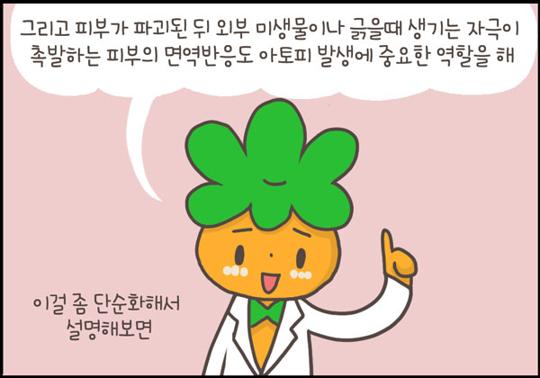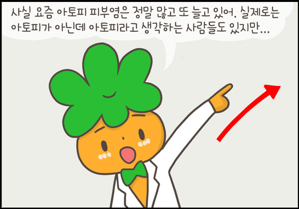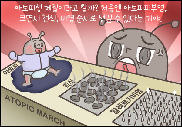 이전에 알레르기비염과 천식에 대해서 다루어보았습니다. 이번에는 일명 ‘알레르기 행진’, ‘아토피 행진’ 중의 하나인 아토피 피부염에 대해 그려봤습니다. 아토피 피부염은 점점 늘어나고 있습니다. 생활 환경과 습관의 변화와 관련 있을 수도 있고, 아토피 피부염이 아닌데도 아토피라고 생각하는 사람도 꽤 되기 때문에 그런 숫자가 더해진 것도 있겠지만…
