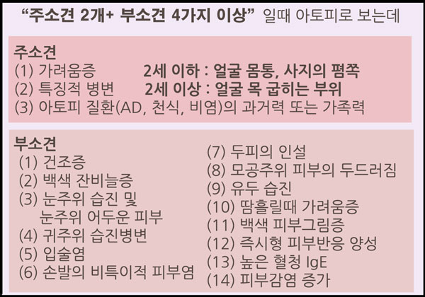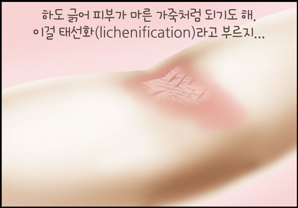 그래서 아토피 피부염을 확진하는 검사는 없으며 진단 또한 진단기준표에 있는 항목들, 증상에 맞춰서 진단하도록 되어 있습니다. 특징적으로 만 2세 전에는 얼굴, 몸통, 팔다리의 폄쪽에 생기는데 빨갛고 약간 오돌도돌한 튀어나온 발진에 긁어서 까진 상처에서 투명한 진물이 나옵니다. 그리고 나이가 들면 주로 팔다리가 접히는 부위, 얼굴 목 같은데 생기게 되고요. 이걸 너무 긁다보면 피부가 가죽처럼 변하는 태선화 (lichenification)가 진행됩니다.