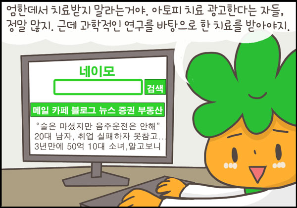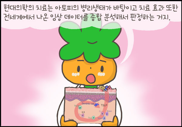 앞서 얘기했듯이 아토피 피부염의 기전은 아직 정확하게 나온 것이 없습니다. 다만, 전세계의 많은 연구자들이 과학적인 접근으로 치료방법을 찾아내려고 노력하고 있는데, 이런 과학자, 과학적 의사들의 노력에도 불구하고 애매하고 치료가 어려운 환자들도 꽤 있기 때문에 근거 없는 치료에 매달리는 사람들도 많습니다.
