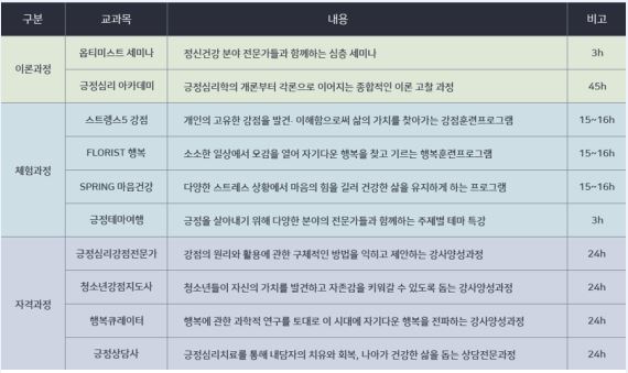 긍정학교의 과목은 배움 Class, 실천 Project, 확산 Story로 구성되어 있다.