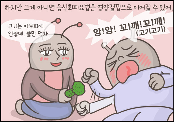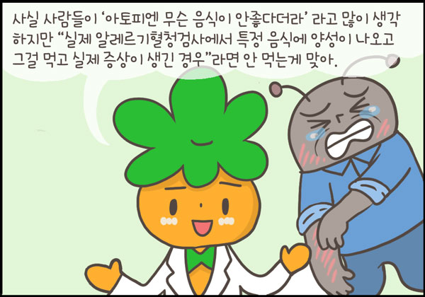 아토피피부염과 음식을 연관 짓는 얘기가 많이 있지만, 과학적인 연관성은 ‘알레르기 검사에서 특정 음식에 양성이 나오고, 그 음식을 먹었을 때 아토피가 심해진다’는 명확한 연관성이 있는 경우에만 가려먹는 것이 도움된다고 합니다. 즉, ‘무슨 음식이 아토피에 좋다더라, 안 좋다더라’는 잘못된 이야기입니다.