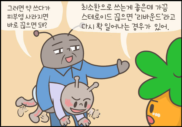 아토피에 쓰는 약은 먹는 항히스타민제, 스테로이드 연고, 항생제 연고, 국소 칼시뉴린 억제제 연고 등이 있습니다. 먹는 항히스타민제는 알레르기반응을 줄여주는 약으로 기본적으로 많이 사용합니다. 스테로이드 연고는 피부염이 실제 발생한 곳에 바르면 좋은 치료 효과를 보이지만 과용 시 피부위축, 여드름, 모세혈관확장증 등의 부작용이 발생할 수 있어 주의가 필요합니다. 항생제 연고는 긁게 되면서 생기는 세균의 2차 감염이 있는 경우에 쓰게 됩니다. 칼시뉴린 억제제 연고는 면역억제제로 효과가 좋고 스테로이드의 부작용이 없어 점점 사용량이 늘고 있긴 한데 대표적으로 피부 화끈거림 등의 부작용이 있을 수 있습니다.