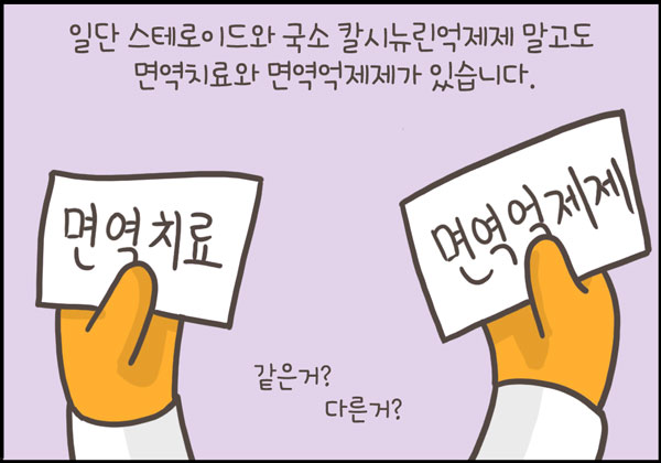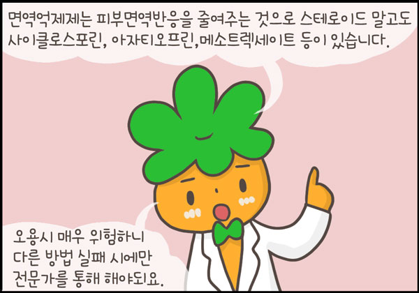 면역치료는 알레르기비염에도 소개했던 내용입니다. 알레르기 연관성이 증명된 경우에 항원에 노출을 점진적으로 시킴으로써 면역반응을 줄여주는 방식입니다. 면역억제제는 피부 면역반응 자체를 줄여주는 것으로 스테로이드 말고도 사이클로스포린, 아자티오프린, 메소트렉세이트 등의 약도 있고 마지막으로 아토피 기전에 작용하는 특정 물질을 억제하는 생물학적 제재들도 아토피에 사용하기 위해 연구가 진행되고 있습니다. 광선치료는 치료가 잘 안되는 환자들에서 좋은 효과를 보였다고 하지만 피부암이나 피부노화의 우려가 있습니다.