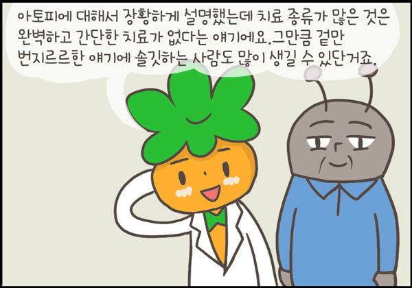 아토피의 치료약과 치료법에 다양한 것이 있는 만큼 완벽하고 절대적인 치료법이 있지는 않습니다. 하지만 근거에 바탕을 둔 연구들이 전세계에서 진행되고 있기 때문에 의사들의 지도를 믿고 따라주는 것이 좋습니다. 치료가 쉽지 않은 아토피 피부염 같은 병에는 환자와 보호자를 속이는 치료법들이 많이 성행하는 법입니다. 아토피의 치료는 길고 지루한 과정이 될 수도 있지만 잘 따라오면 잘 관리할 수 있답니다.