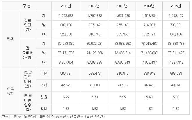 진료유형에 따라 2015년 진료현황은 입원의 경우 진료비용이 1인당 약 66만4,000원, 내원일수는 5.4일이며, 외래의 경우 진료비용이 약 4만8,000원, 내원일수는 1.6일 진료를 받은 것으로 분석되었다.