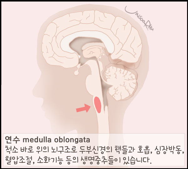 연수 medulla oblongata: 척수 바로 위의 뇌구조로 myelencephalon이라고 한다. 여기에는 두부신경의 핵들과 호흡, 심장박동, 혈압조절, 소화기능 등의 생명중추vital center들이 있다.