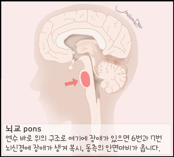 뇌교 pons: 연수 바로 위의 구조로, 연수와 더불어 후뇌hind-brain라 한다. 여러 pontine nuclei들이 있다. 여기에 장애가 있으면 제6, 7뇌신경에 장애가 생겨 복시diplopia, 동측의 안면마비ipsilateral facial paralysis가 온다.