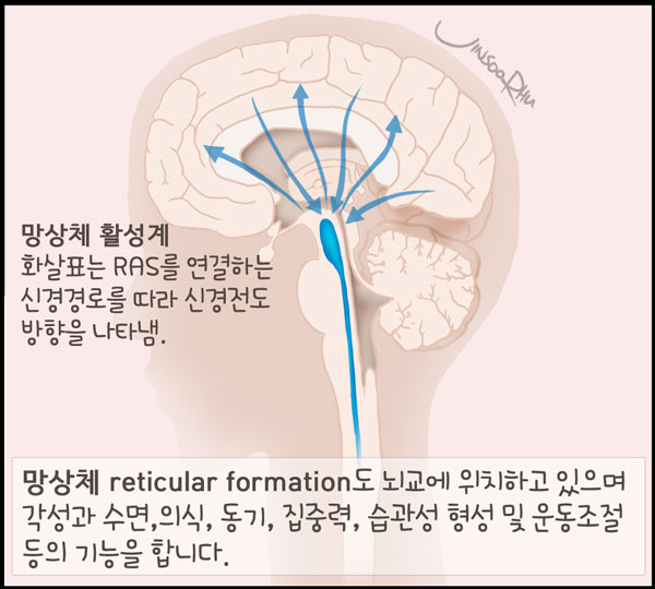 망상체reticular formation는 각성과 수면, 의식, 동기motivation, 집중력, 습관성 형성 및 운동조절 등의 기능을 한다.
