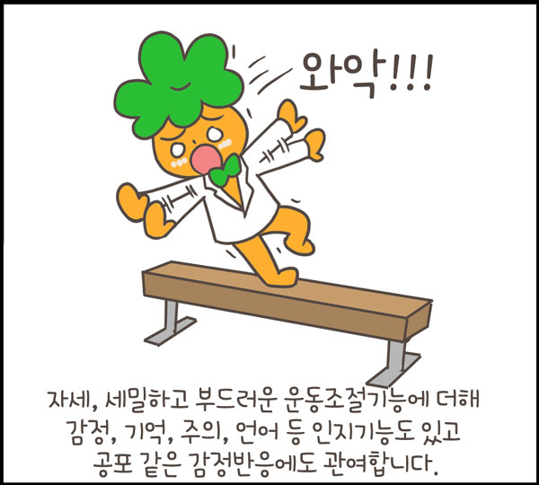 기능과 관련해서는 자세, 세밀하고 부드러운 운동조절기능에 더해 감정, 기억, 주의, 언어 등의 인지기능도 있고, 공포 같은 감정반응에도 관여한다는 것이 밝혀졌다.