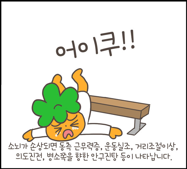 소뇌가 손상되면 동측의 근무력증ipsilateral hypotonia, 운동실조, 운동거리조절이상dysmetria, 의도진전intentional tremor, 병소 쪽을 향한 안구진탕 등이 나타난다.