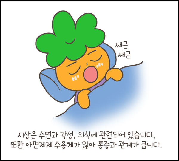 아편제제opiate 수용체가 많아 통증과 관계가 크다.