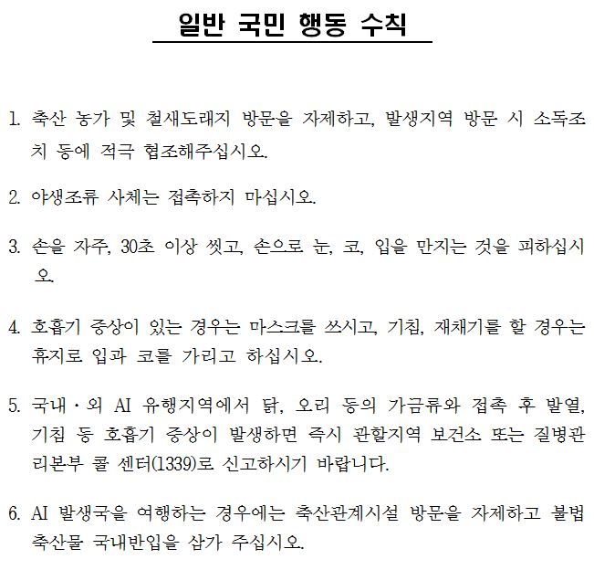 일반 국민들은 AI 인체감염 예방을 위해 축산농가 또는 철새도래지 방문을 자제하고, 30초 이상 손씻기 등 개인위생수칙을 철저히 하고, 축산농가 종사자 및 가족은 개인위생에 세심한 주의를 기울이고, 축사 출입 시 적절한 전용작업복을 착용하며, AI 의심축 발견 시 신속하게 가축방역기관(1588-4060, 1588-9060)에 신고해야 한다.