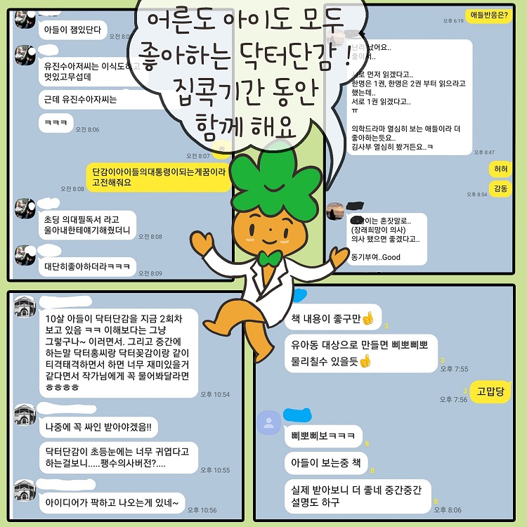 단감: 전혀 몰랐습니다. 심지어는 제가 그린 만화를 저희 딸한테 보여준 적도 없었어요. 어느 날 제 컴퓨터에서 닥터단감 충수돌기염 편을 열심히 읽던데, 그냥 컴퓨터로 보니까 호기심이 생겨서 그런 줄 알았어요. 어쨌든 어린이들이 좋아해 줘서 기쁘고 그에 맞는 만화를 더 그려볼 생각도 하게 됐습니다.