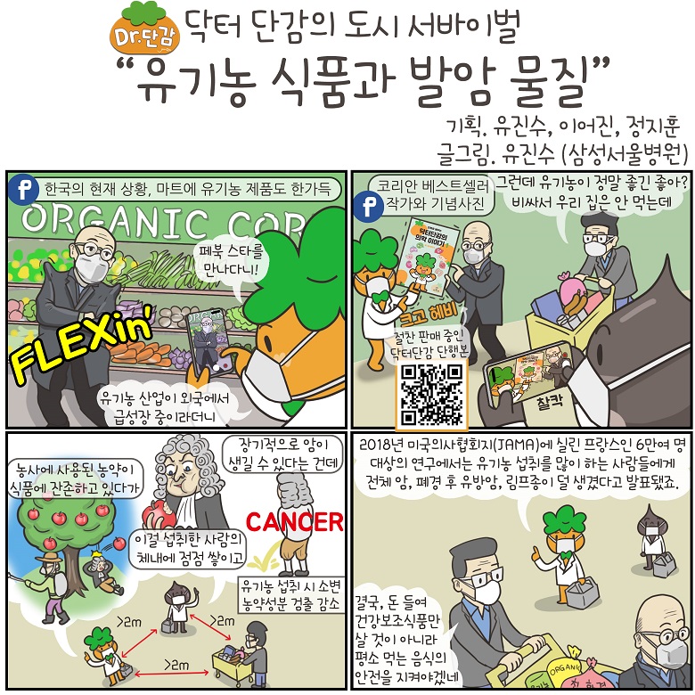 단감: 사실, 옛날에 그린 만화를 보면 많이 어설프다는 느낌을 받고 있어서 그런 만화라도 재밌게 읽어주는 분들이 있다는 점에 감사하고 있습니다. 닥터단감을 처음 만들 때 ‘먼나라 이웃나라’같이 건강분야에서 믿을 수 있는 ‘브랜드’가 되는 것을 목표로 하고 시작했었습니다. 지금은 유튜브 등에서 많은 의사 선생님들이 열심히 활동하고 있는 반면에 단감을 많이 그릴 기회가 없어서 스스로 불만족스러운 것이 사실인데, 천천히 꾸준히, 제가 정년 퇴직을 한 뒤에도 그리는 것을 목표로 독자분들과 함께 하고 싶습니다.