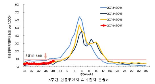 인플루엔자 의사환자수(유사증상환자)는 2016년 46주(11.6.∼12.) 4.5명, 47주(11.13.∼19.) 5.9명, 48주(11.20.∼26.) 7.5명(잠정치)으로 유행기준(8.9명)에 근접하고 있다.